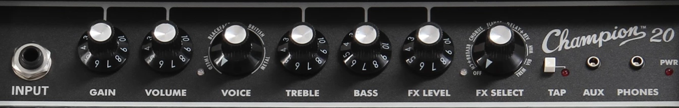 Controlos para ganho: Volume, Voice, Treble, Bass, FX level and FX select