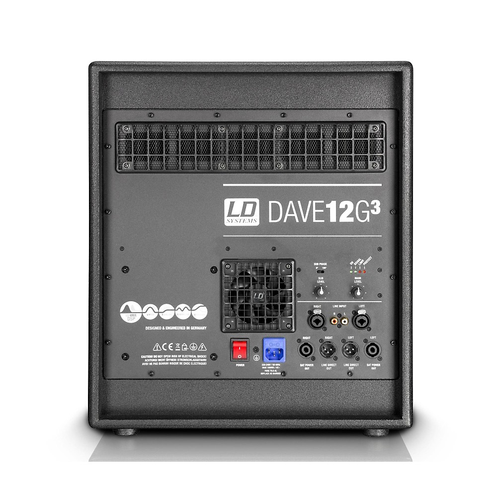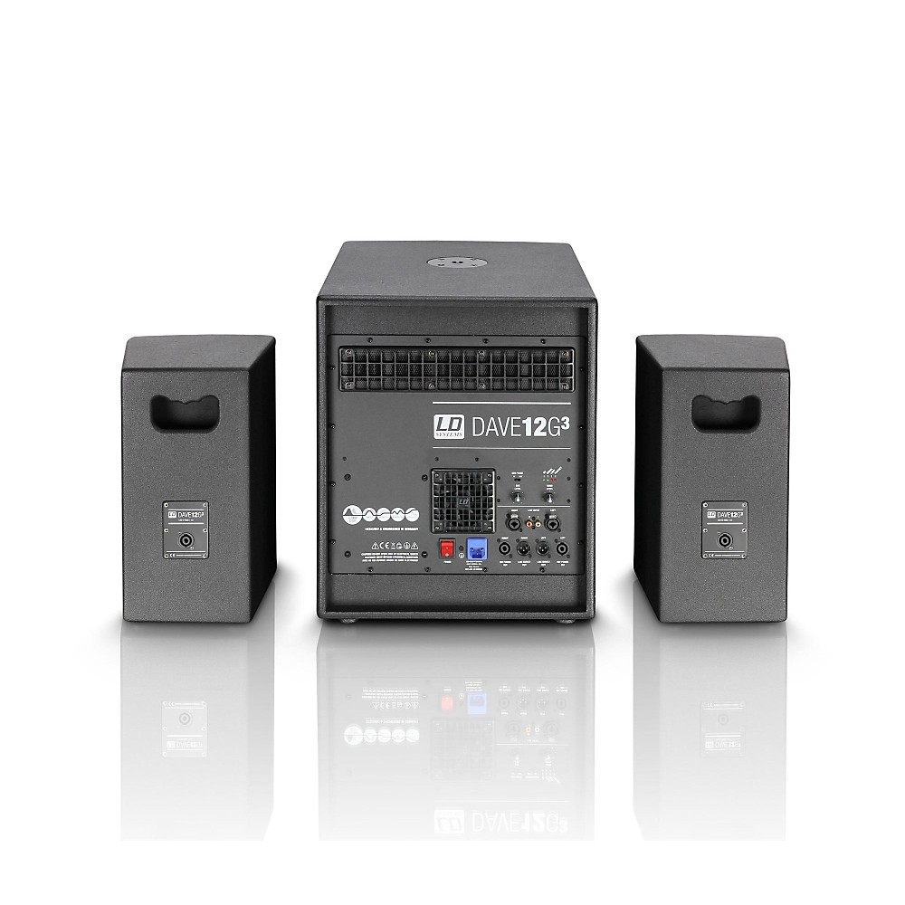 O novo sistema LD Systems DAVE 12 G3 é o PA activo perfeito para pequenas e grandes actuações ao vivo, apresentações multimédia e instalações permanentes em bares, clubes ou outros. O grave de 12" tem baixos bem definidos e os satélites com 6,5" garantem um bom som com médios naturais e agudos nítidos. O amplificador está embutido no subwoofer e amplifica os componentes do sistema, com 2000W de pico. A principal característica do DAVE 12 G3 é o processador LECC DSP de sinal digital LD, que controla as funções de todo o sistema. Inclui crossovers e foi optimizada a baixa latência, tem equalizadores independentes e limitadores para o baixo, médio e agudo e ainda um compressor dinâmico que controla o subwoofer de acordo com o volume. O sistema G3 DAVE 12 é ideal para uso portátil ou instalações permanentes.